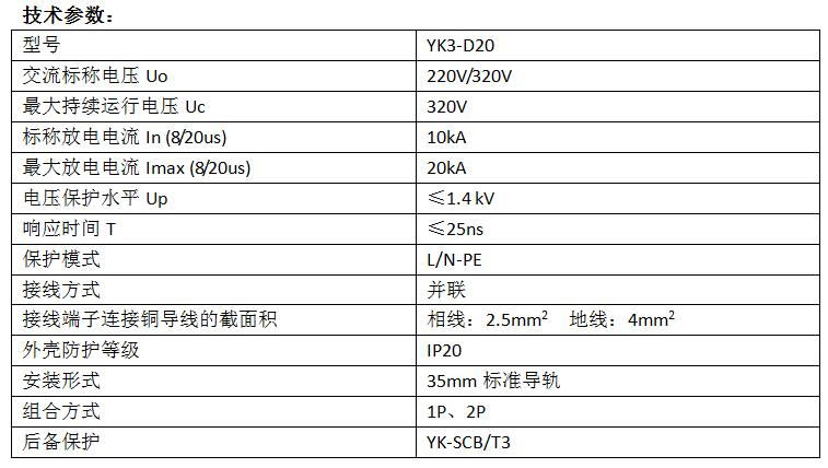 YK3-D20型電涌保護(hù)器采用35mm導(dǎo)軌安裝方式,具有很高的雷電流泄放能力,單模塊最大放電電流最大可達(dá)20kA(8/20us),可防范直擊雷在內(nèi)的各種電涌,應(yīng)用于設(shè)備系統(tǒng)的電源末端防雷,可組合用于單相/三相供電線路。
